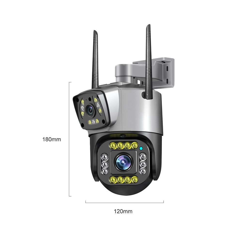 The PTZ function supports 355° horizontal rotation and 90° vertical movement, with up to 6 preset positions for quick navigation. The dual-lens system enhances coverage, making it suitable for monitoring entrances, warehouses, yards, or interior spaces.