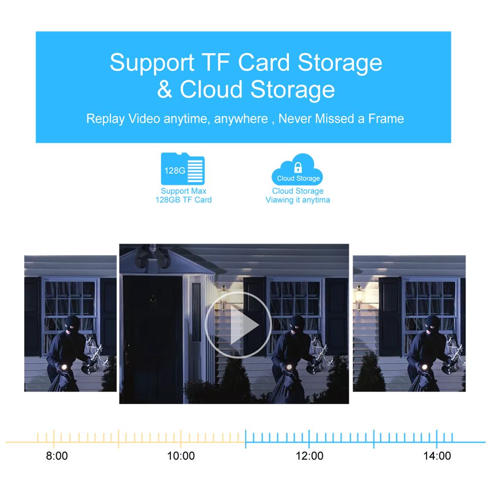 Storage is flexible with support for TF cards up to 128GB and optional cloud storage. The unit requires a 12V/2A power supply (adapter optional).