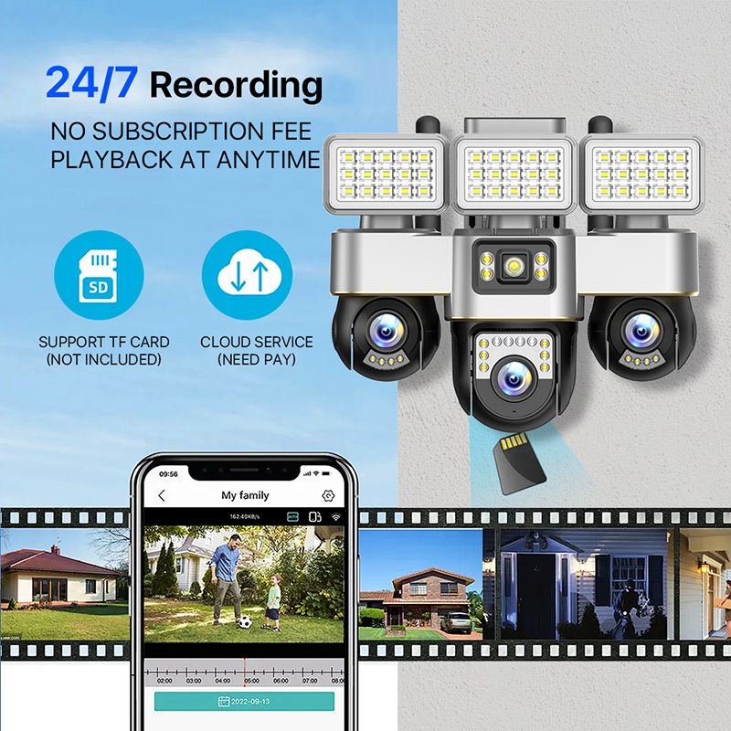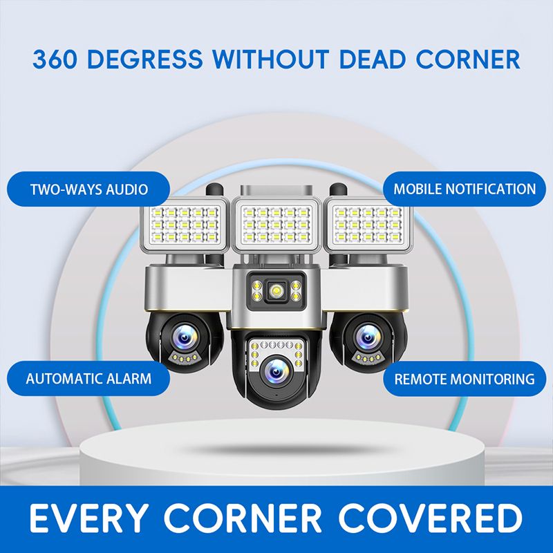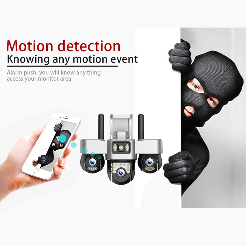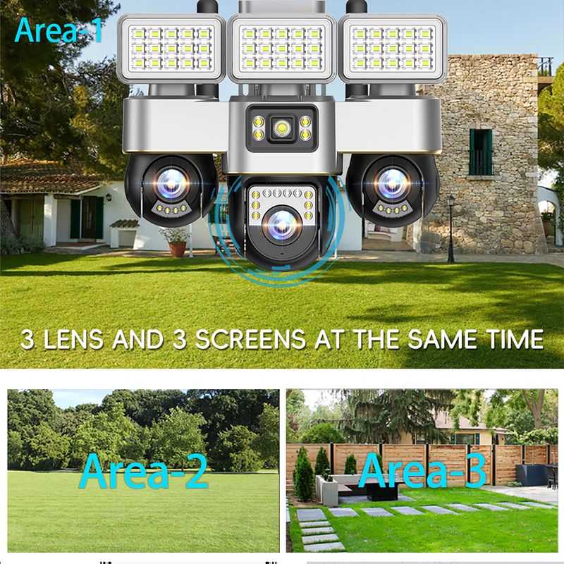 Equipped with three 1/4.6" SC1346 CMOS sensors, the camera delivers a combined 6MP resolution (2+2+2). Each 4mm lens provides wide-angle coverage and detailed monitoring, while the PTZ mechanism supports 355° horizontal and 90° vertical rotation, with 6 preset viewing points for efficient repositioning. This makes it ideal for monitoring yards, farms, warehouses, and other remote or large outdoor areas.
