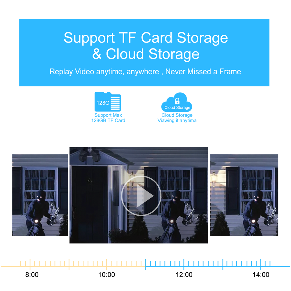 With a 3.0MP (2304 × 1296) resolution, the camera provides clear and detailed video both day and night. Advanced H.264+/H.265 compression ensures efficient storage, supporting TF cards up to 128GB and optional cloud storage for alarm recordings.